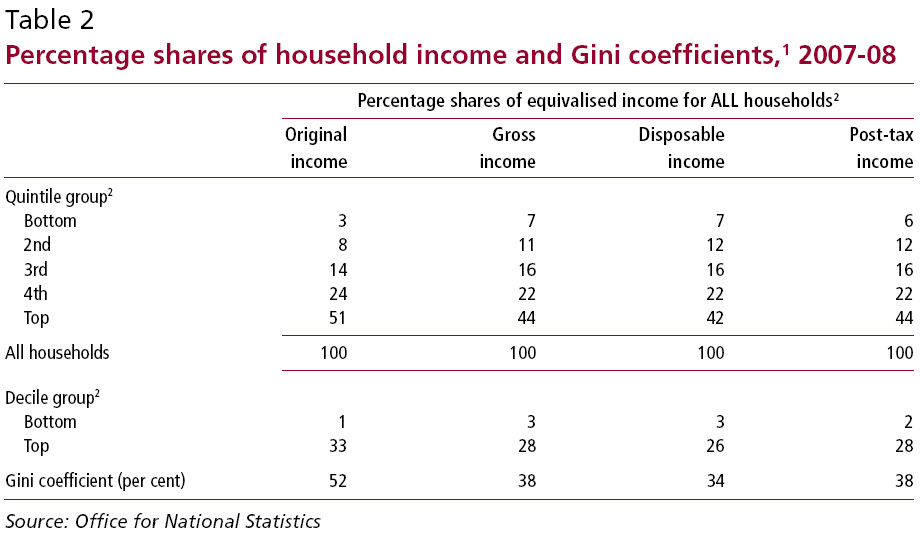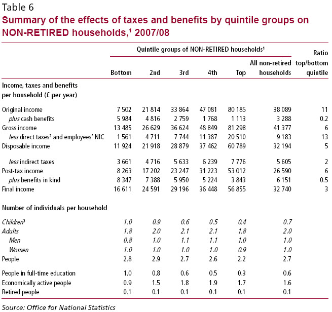 The effect of the tax and benefits system is to reduce a top to bottom quintile ratio of 16 in 4. That seems strongly progressive to me – more so than I would have expected.