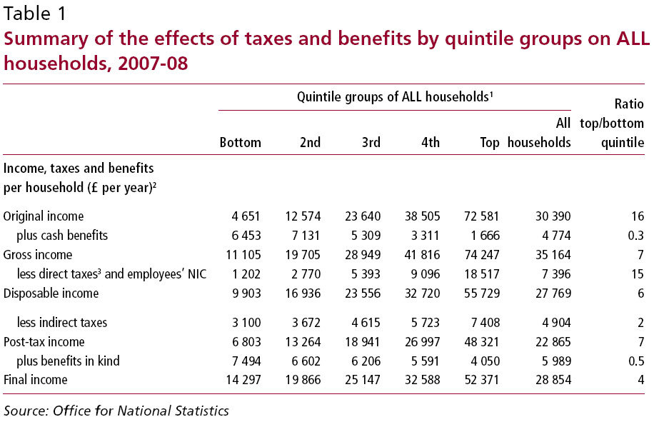 The Office for National Statistics has issued a new report entitled “The effects of taxes and benefits on household income, 2007/08”. Not the most gripping title you might say, but the data is fascinating so I’m reproducing a whole series of tables from the report here, but would add there is a lot more still within the original.