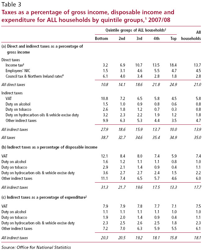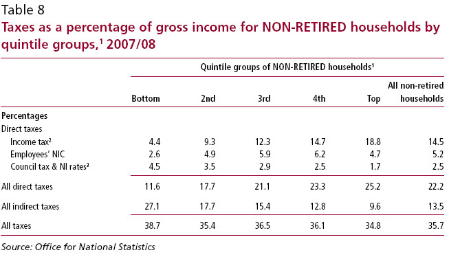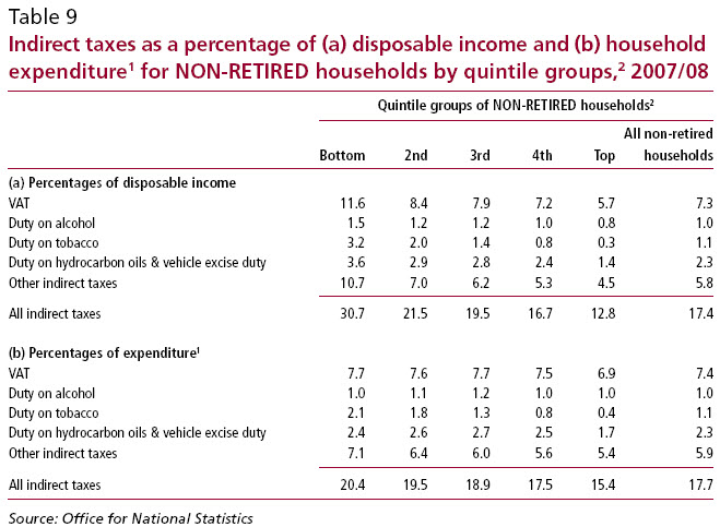 Here we have the real picture of UK taxes: overall a regressive system where middle and poorest pay most and the best off least. The argument for a more progressive tax system is extraordinarily compelling, if only to counter act these horrible imbalances in indirect taxes: