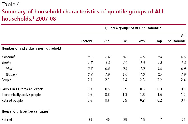 The wealthiest have the lowest number of children per household. It’s an issue I will return to later. Note too how the trend of those in full time education falls as one rises through the quintiles: this partly explains the move in the opposite direction of those who are economically active. Pensioners explain a lot of the rest. The combined figure for both in the lowest quintile is 1.3, in the highest it is 0.5. The difference in economically active is 1.0, but its clear when looked at this way lack of availability of work is not the major issue.