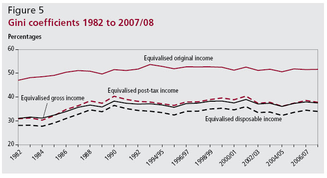 20% enjoy 44% of post tax income: 20% just 6%. That is more than a sevenfold difference, and using quintile data mutes the extremes. The decile data disparity is 14 fold. The Gini coefficient is a measure of inequality: 0 is total equality, 1 is all income goes to one person inequality. Again, I return to this below.