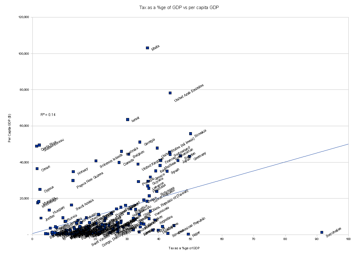 First of all, as far as I can tell, the regression coefficients Gary has referred to do not reflect a particularly robust test of the correlation we're talking about. I'm afraid the reason for this is that the way the trend lines in your graphs appear to have been produced is not the best way of using these data. I think what they effectively demonstrate is the extent to which a country's rank in the tax-rate league table is correlated with its per capita GDP. As we see, there is a correlation, but what they don't reflect, however, is the correlation between a country's actual rate of tax and per capita GDP. The size of the difference in tax rate between a country and the one ranked immediately below it is not factored in. Fortunately, given the distribution of the data and the number of countries involved, this doesn't appear to have a huge impact on the correlation demonstrated, but in order to conduct a robust analysis it is inappropriate to reduce the data in this way.