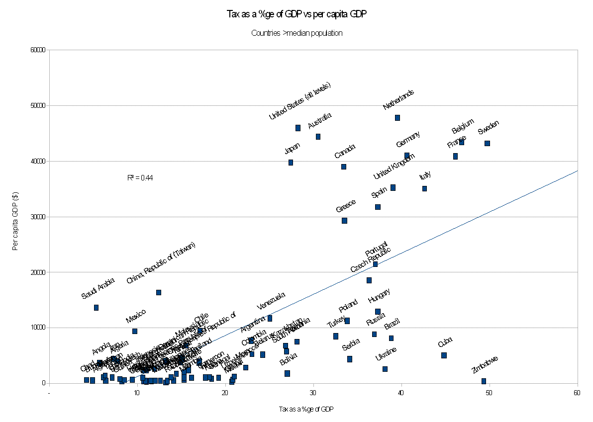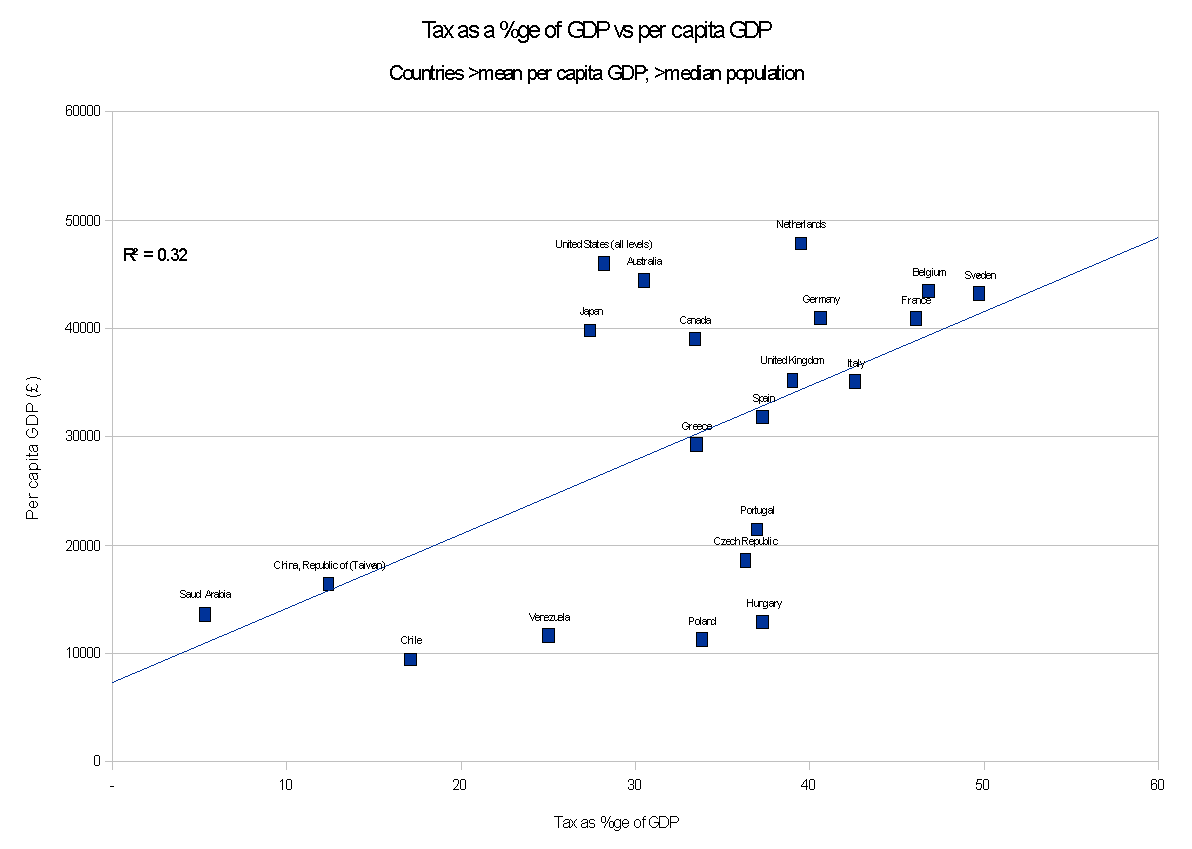 The (slightly less) strong correlation shown among this group appears to suggests that tax as a proportion of GDP remains relevant even as a country becomes more prosperous.
