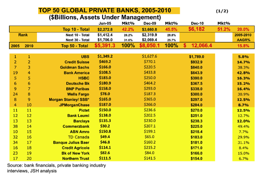 Jim Henry's work for the Tax Justice Network on The Price of Offshore Revisited includes some extraordinary data. This table is one such example. It shows the assets under management in the 20 leading private banks that manage the assets of the world's wealthiest people and data on the assets managed by the top 50 such banks: