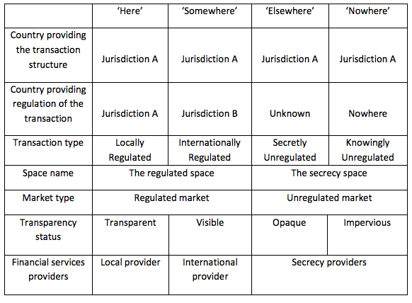 Thirdly, this paper shows that the illicit financial flows that are the cause of concern with the secrecy world do not flow through locations as such, but do instead flow through the secrecy space that secrecy jurisdictions create (secrecy jurisdictions being the new term tax havens). As the paper shows, to locate these transactions in a place is not only impossible in many cases, it is also futile: they are not intended to be and cannot be located in that way. They float over and around the locations which are used to facilitate their existence as if in an unregulated ether. This suggests that any attempt to measure or regulate them solely on a national basis will always be problematic.