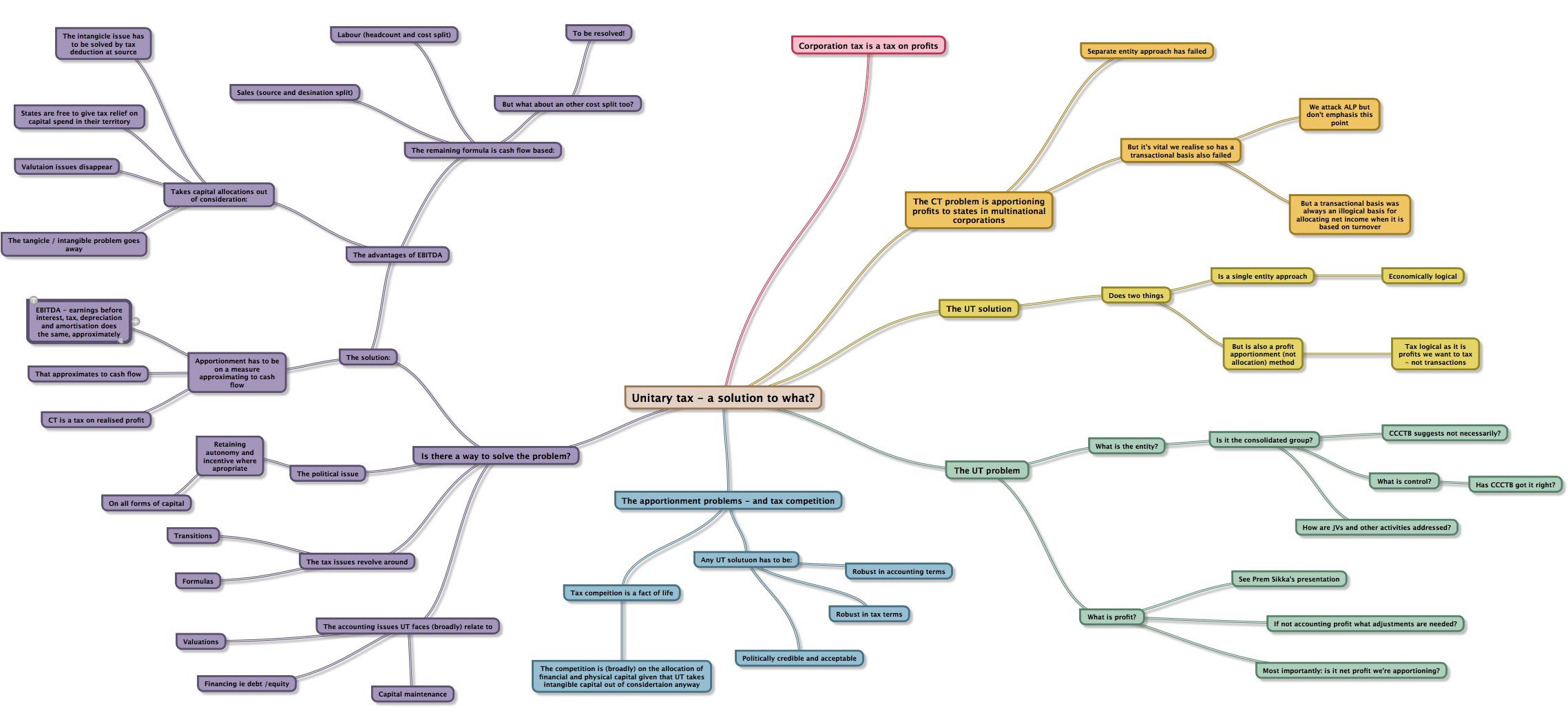 Much of the discussion during the day will focus on unitary taxation as an alternative to the now discredited system of arm's length transfer pricing for apportioning the profits of multinational corporations between states. Theoretically unitary taxation has to offer better solutions than the existing OECD endorsed methods of profit allocation which are costly, bear no relationship to economic reality and are open to widespread abuse. However, unitary taxation also has its share of problems, not least with regard to determining what is profit.