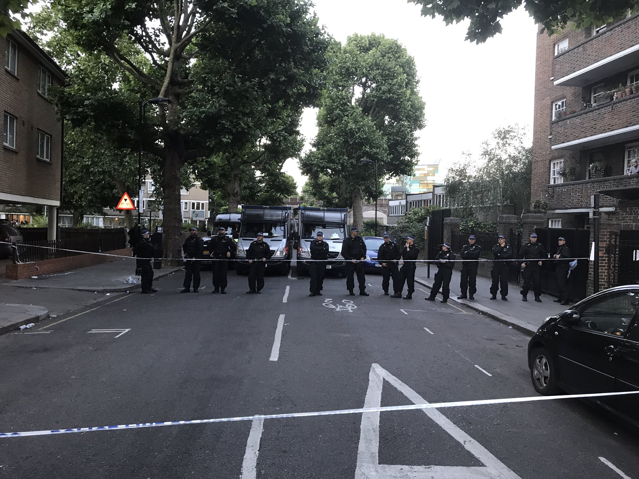 It originates from this picture on Twitter, captioned “Oliver Pritchard†@journo_oliver Jun 16 Riot police man the streets near Grenfell Tower. Are they expecting trouble?”