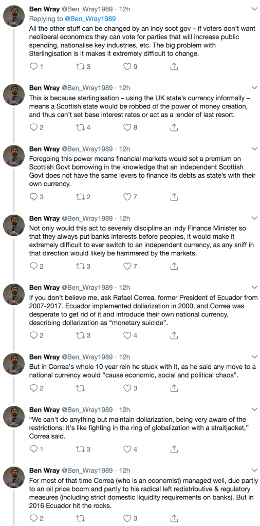 I don’t think you can assume Scotland to be a fertile ground for MMT concepts when the wider UK remains so far away from acceptance of the truth. I’m also surprised that Ben Wray thought it a good idea to bring Venezuela into his thesis – OK for an academic discussion, but again likely to frighten the horses.