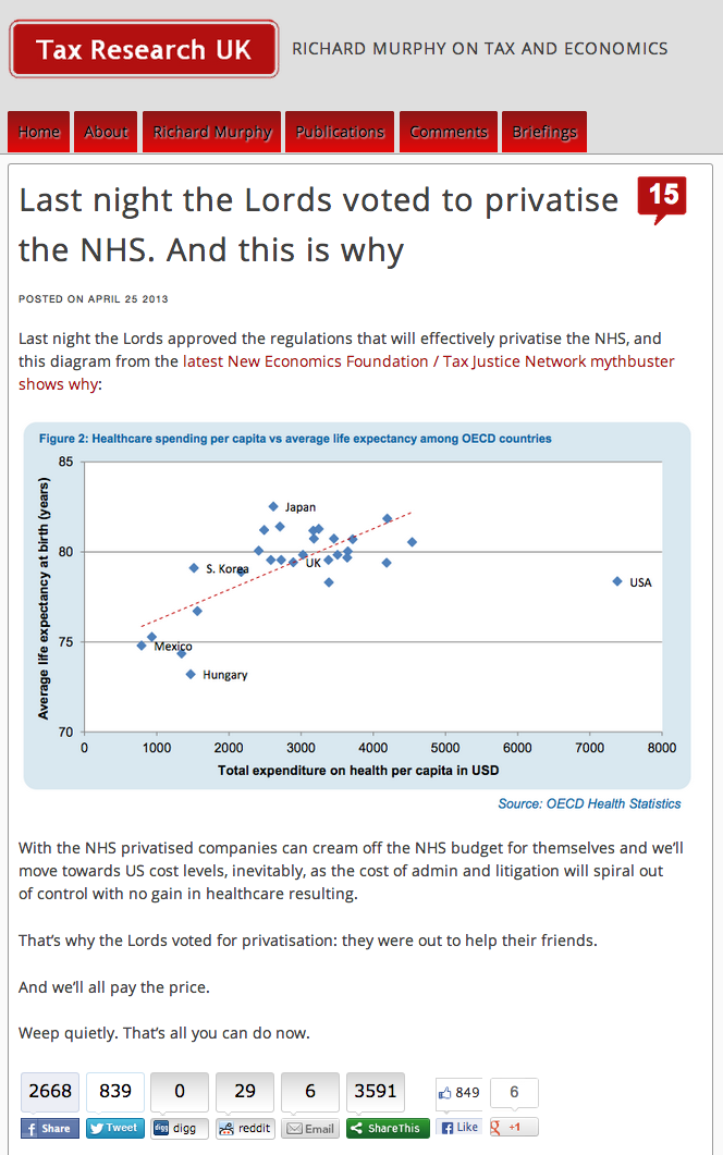 Perhaps one word of caution – it would be unwise to pretend that even if the market is not the best way of providing decent healthcare for all, that doesn’t mean that there are still not very serious debates to be held as to the interests of providers and users should be balanced and that there are some areas why financial discipline within the NHS has always been pretty awful e.g. purchasing from the pharmaceutical companies, capital and IT expenditure and where the level of skills need to be improved. Although, given the scale of the undertaking my guess is that this would be better done by the NHS employing its own people rather than outside consultants (with their additional overheads and profit margins)