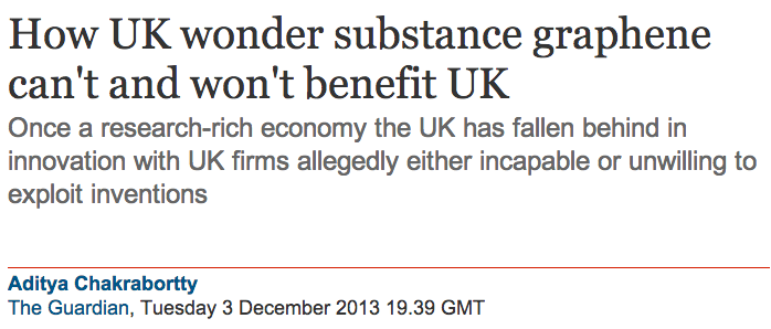 A very interesting and insightful piece by Aditya, Richard. Two years ago a colleague and I used graphene as a case study of possible future innovative activity for an OU module we wrote. On the basis of what we observed had happened to many of the discoveries by UK universities since 1990 we thought it unlikely the exploitation of graphene would come to much in the UK, but not wishing to be seen as negative we left those conclusions out. It seems we’ll have to go back and revise what we said and add a link to the Guardian article.