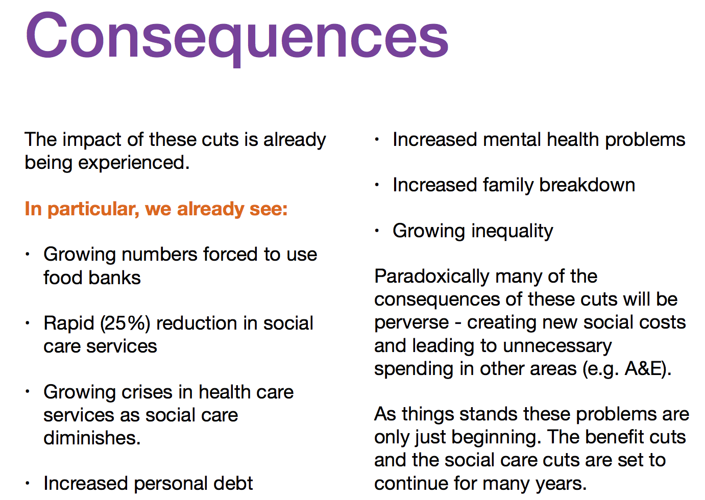 In the end Labour clearly has to lead vigorously from the front on this giving a narrative of growing inequality and the disproportionate attack on the weakest; but it needs to do so in terms too of the economic ‘perverse’ effects of all this on hospitals, mental illness, poor and school drop outs, people living on the street, drugs and crime etc., It is up to Labour to juxtapose the social models of the divided USA and say Denmark ( the happiest country in the world). Polls continue to show Labour in the lead. Most Brits are not Right Wing Tories.