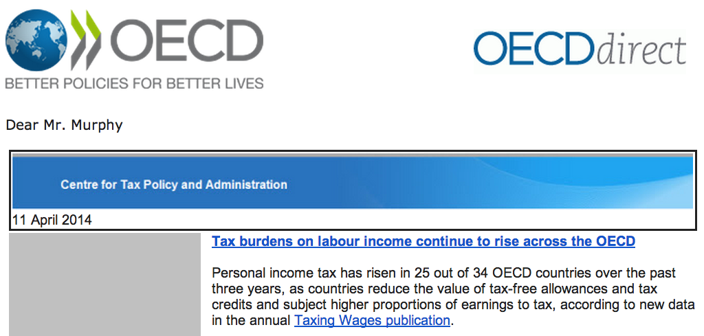 One of the underlying important themes that the Tax Justice Network and I have emphasised over the last decade has been the continual shift of the burden of taxation from capital onto labour.  As if evidence were needed that this trend is continuing, this was the headline from an email that I received this morning from the OECD: