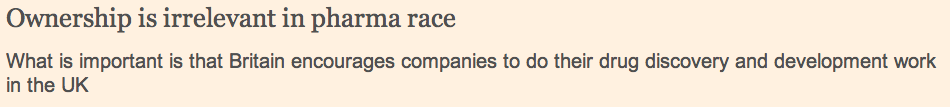 Lastly, I have to say tax matters. US Companies aren't too good at paying tax in Europe right now. I want to see a return on the UK's investment in pharmaceutical companies, and don't believe that will happen with a US controlled company undertaking research here.