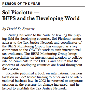 I've worked with Sol for more than a decade now and have appeared with him as part of the process of giving civil society evidence to the BEPS process and he brings a towering intellect, a lot of tenacity and no little passion to the task of leading the BEPS Monitoring Group. I'm delighted he has had his work recognised in this way. Civil society has played an enormous part in reshaping the tax agenda - and those around the Tax Justice Network in particular. It's good to see Sol's massive contribution recognised.