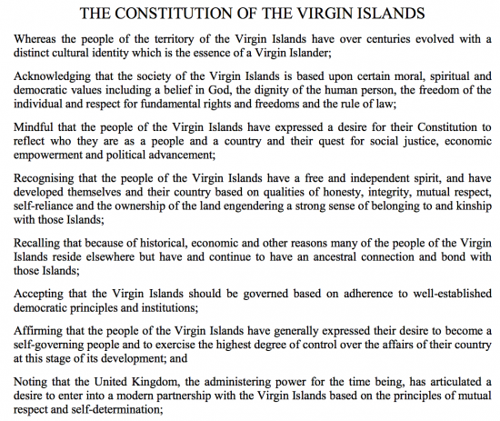 The BVI constitution is available here. First, note that if there is any doubt as to the right of Westminster to legislate for it, this constitution is a statutory instrument of the Westminster parliament. I suggest their Lordships should take note.