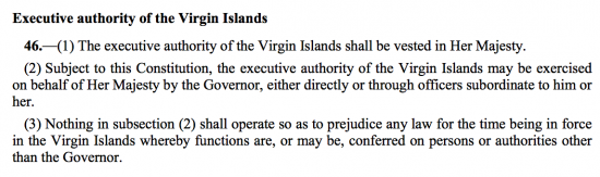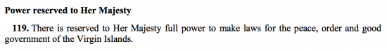In other words, the Governor, if instructed by Her Majesty (or, in practice, one of her minsters) could, without a shadow of doubt make a law for the type of public registry of companies that David Cameron thought so important if they thought it appropriate to do so, and if they did the Constitution makes it absolutely clear that there is nothing the BVI could do to stop them.