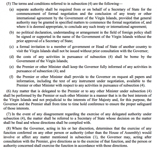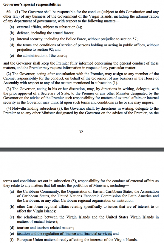 However I don’t think your argument that “matters relating to taxation, the regulation of finance and financial services are all reserved powers for exercise by the Governor” holds up at all. What 60(4) does is allow the Governor to delegate a part of his reserved powers for the conduct of external affairs. Matters relating to taxation etc. that aren’t part of the conduct of external affairs are not affected by Article 60(4) at all and so presumably are matters where the Governor is required to act on the advice of the BVI cabinet.