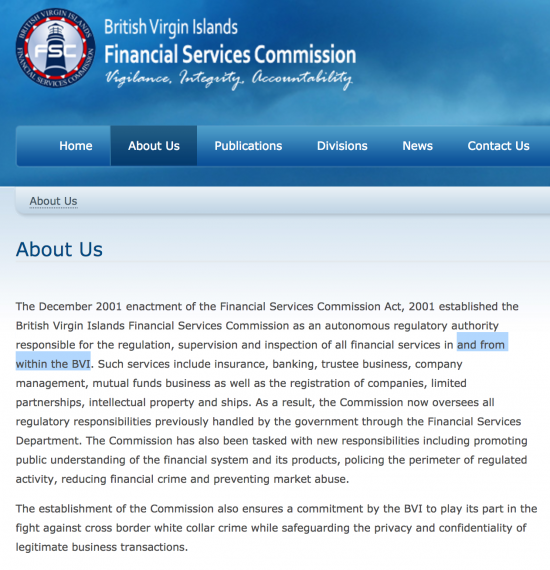 Facts alone support this. No one can pretend that BVI needs 417,000 companies, 1,614 mutual investment funds, 176 insurers or 211 banking and fiduciary operations to service a local population of 28,000 people. These entities exist, almost exclusively, for the benefit of people 'elsewhere' i.e. anywhere but the BVO. The BVI know this. The BVI Financial Services Commission says (I added the highlight):