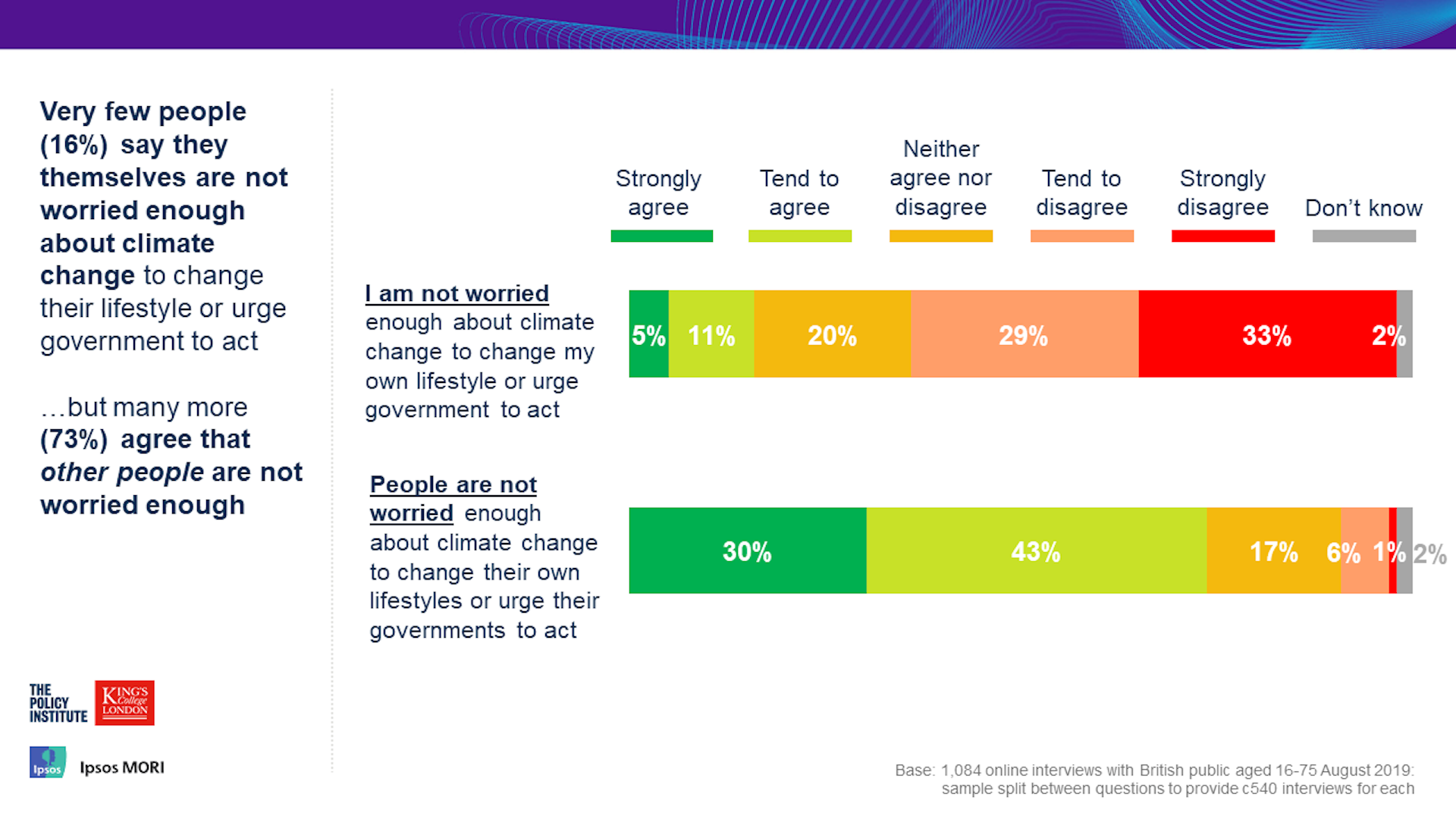 Despite record levels of public concern, 73% believe that other people are not worried enough – while only 16% say we ourselves are not worried enough. Half of us say that other people think it's too late to do anything to prevent a climate change emergency, but only one in five of us admits to having given up hope. This misunderstanding of the norm is serious, as it affects our own sense of efficacy: if others aren't bothered, what's the point in us acting?