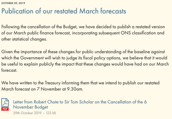 I am hoping the election does not change this: I presume it was already taken into account, and as a matter of fact the Office for Budget Responsibility has a legal duty to report twice a year, which would be nigh on impossible if it did not report next week.