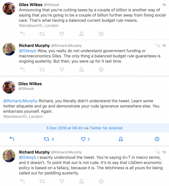 This [LibDem policy of running a government surplus] is hard-core, right-wing neoliberal economic illiteracy. It manages to make George Osborne look left-wing. And it shows not the slightest understanding of economics, the role of government in society or the nature of money and its relationship to tax. It's also callously indifferent to society, the role of government, all who work in it and all who are dependent upon it.