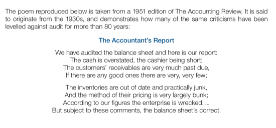 I have begun reading Sir Donald Brydon's new missive on auditing, issued this morning. I was immediately drawn to page 135, where this might be found:So, nothing much has changed then....