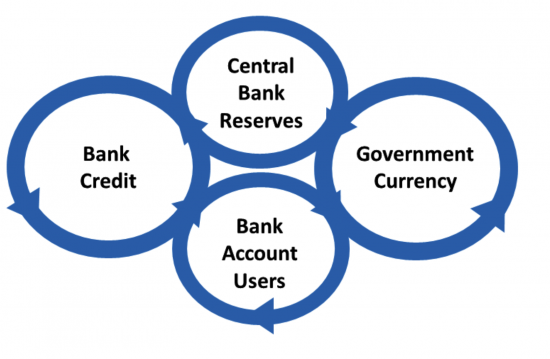 Figure 1: Schematic diagram of the monetary system of a sovereign nation. Bank account users cannot distinguish the origin of their deposits.
