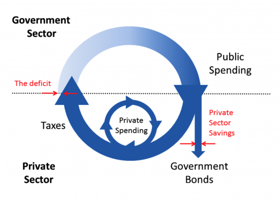 In the government circuit, money is spent into the economy and is effectively cancelled when it returns to the government via the payment of taxes. The collection of taxes is not a prerequisite for government spending as many people assume, but exists at the end of the government money cycle when taxes removed prevent too much money being created. Taxation mainly helps to control inflation and alter peoples' behaviour in a way that should be beneficial to all. The net result of deficit spending is to leave savings in the form of Government Bonds in the hands of the private sector (Figure 2).Figure 2: The government spend and tax circuit with a deficit. The difference between spend and tax equals private sector saving and is known as the deficit.