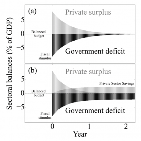 Conversely a government surplus (where taxation exceeds spending) would destroy these savings. The superficially sensible idea of running a balanced government budget simply prevents saving in the private sector. This is illustrated in models a) and b) within Figure 3. In a) the government injects money via a fiscal stimulus in year zero. Taxation means that over time all this money is returned. In b) the public choose to save a fraction of their income which leads to the deficit. Savings simply delay the return of money in the circuit. In other words, the private sector is only able to save money because the government supports this activity by running a deficit. The government circuit is leaky by design. For example, people are encouraged through tax breaks to save for their future (e.g. pensions & ISAs). Therefore, the national debt is not what we currently owe but what we currently own.Figure 3: (a) model which shows that after government spend (fiscal stimulus) if people do not save then all the money comes back as tax, whereas if people save this leads to the deficit (b).