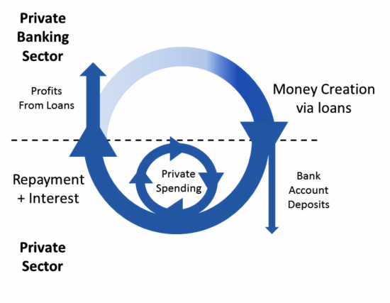 Most of our money is created in the form of bank loans (credit). When a loan agreement is signed the bank creates a new bank deposit to the value of the loan in the borrower's bank account. Money is returned to the bank by the repayment of the loan plus interest (Figure 4). Similar to government spending, bank lending influences private sector behaviour but the allocation of money creation is not democratically controlled. The primary purpose of bank lending is to enable individuals and businesses to function and to generate profits for bank shareholders, both over the short and long-term.Figure 4: The bank circuit where loans concurrently create bank customer deposits and private debt leading to bank profits.