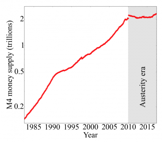 If all the money was returned to the issuers the quantity of money would go back to zero (the balanced budget illustrated in Figure 3a). In practice the rate of new money creation is usually higher than the rate of money cancellation and the total amount of money in the economy grows over time to support economic growth (Figure 5). Ideally growth in the money supply should match the growth in economic activity, such that prices remain roughly stable and we maintain confidence in the value of our currency unit. Control of the rate of money creation and destruction in the government and banking circuits are known fiscal and monetary policy, respectively.Figure 5: UK Money (M4) Supply 1987 — 2017. Source: Bank of England.