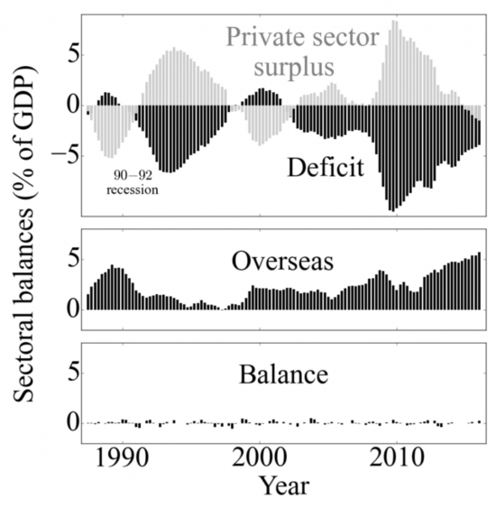 The money supply increased significantly in the decades prior to the Global Financial Crisis (circa. 2007) primarily through bank credit expansion. In contrast, between 2009 and 2014 net credit was negative.[3] As bank credit creation wavered from 2008 onwards, government deficits rose to prevent a deflationary depression. The actual sector balance data for the UK is shown in Figure 6 and there is similarity with the simple model we presented in Figure 3. Note that the rest of the world is a net saver of UK money (these savings have to be spent in the UK ultimately). Note also that when these three sectors combine, the balance is near zero as this is nothing more than an accounting identity.Figure 6: UK sectoral balances data from the ONS. The inverse correlation between Private and Public sectoral balances. Private sector savings mirror the public sector deficit as illustrated by the model in Figure 3.