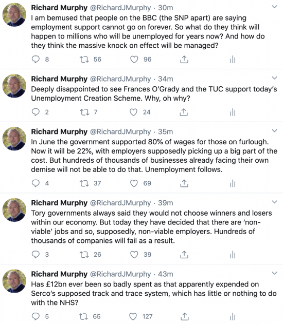 I’ve seen the Resolution Foundation making the very sensible point that the £1,000 job retention bonus (with its massive deadweight cost for all those people who would be retained as employees anyway) could be rolled into the new so-called “Job Support Scheme”, and the extra £7.5 billion or so on top of the £10 billion already expected for JSS could eliminate most of the employer contribution for the time an employee is not working, at least until the spring.