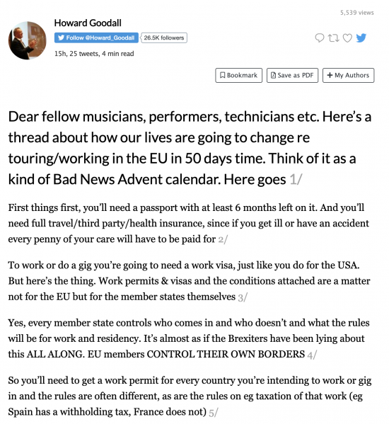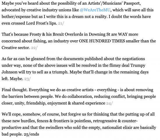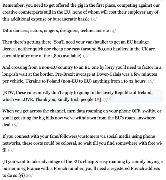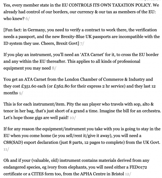 This list of requirements imposed on musicians, and mainly applicable to other performing arts practitioners highlights the fact that a vast amount of basically dangerous detail has been deliberately hidden under simplistic memes such as the infamous “Get Brexit Done!”
