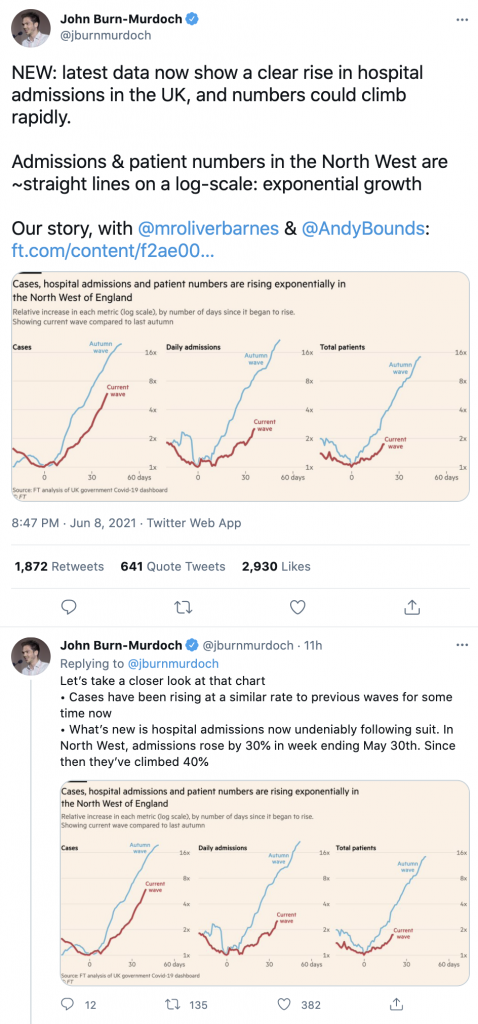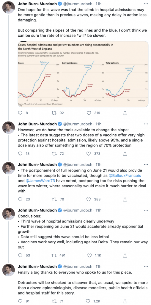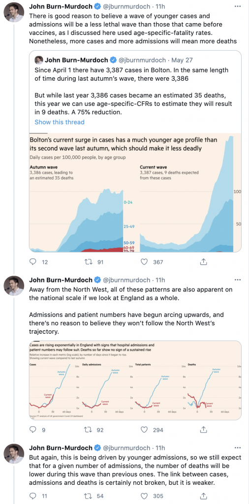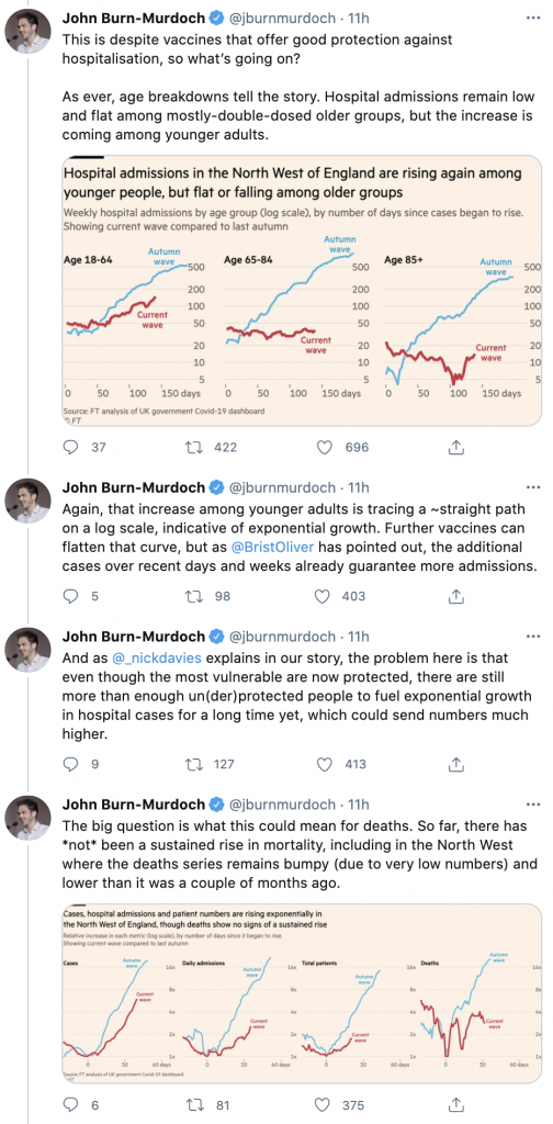 Thanks for sharing FT data analysis. I do have one question, which is about ‘pushing the wave’ into winter. Do people really think that if we let this one rip, there won’t be one in winter. It seems to me that the virus is endemic, and waves occur whenever there is an increase in contact between people. Suppressing the virus now will make no difference to a wave in winter. There will probably be one just because we’re all indoors more. Although, I am hoping winter cases will be more like a flu surge as vast majority of adults will be vaccinated. Although, it would not surprise me if there is another variant with greater vaccine escape and out govt welcomes it into the UK with open arms.