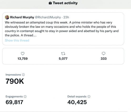 Given that assumption, things can only get worse with further dishonesty, law breaking and authoritarian behaviour, as they do everything possible to cling to power. I fear we will be stuck with them until the next election, given their large majority. The next government, probably Labour, will have a huge task to rebuild the country. That said they will then have a licence for more radical actions, if they have the courage.