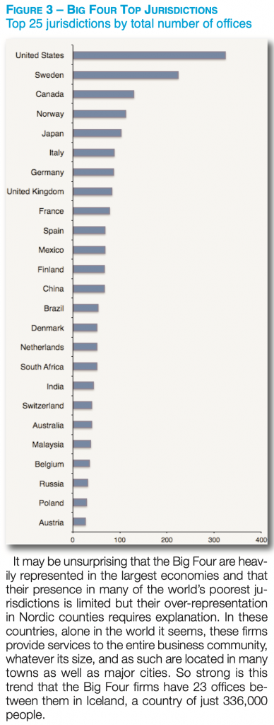 As noted in the previous section, the Big 4 seem to rarely serve local community need outside the Nordic countries. So why are they in all these tax haven locations? It can only be to service international interests - or offshore, in other words.