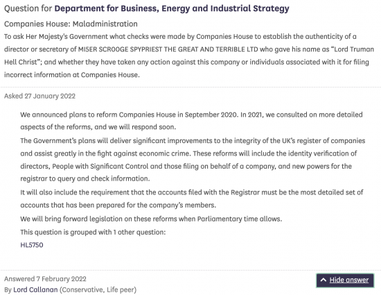 Prof Prem Sikka, my old tax justice friend who now sits in the House of Lords as a Labour peer, has been asking a series of questions of the Department for Business, Energy and Industrial Strategy with regard to failings at Companies House. These are two that have just been answered, wholly inadequately, as is apparent: