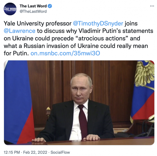 Thank you for the Snyder link BTW. He looks as though he has been really ill. I was bit shocked to see him. The bit where he warns about Putin’s negation of Ukrainian sovereignty leading to violence and desolation was really chilling.