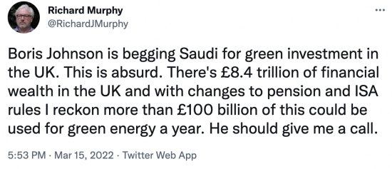 All Johnson has done is turn away from one tyrant to another – from Putin to the House of Saud – need we go in to detail about what they’ve been up to recently? It’s pure opportunism, based on a reluctance to invest home grown or created money and use the Tories much vaunted ‘inward investment’ which led to money laundering being enabled in the first place anyway.