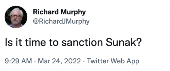 Rishi Sunak is the man in charge of our nation's finances. My question is, is he a fit and proper person to be in charge? Is he objective and able to form an uninfluenced opinion about what is best for this country, independent of Russia's influence on his family's fortune? I don't think he is.