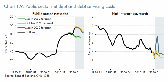 The hike in interest costs this year disappears in 2023 and a downward trend is in place from 2024. Why? Because the accounting accrual for the cost of paying back index-linked bonds is removed from the national accounts when inflation falls again, with no real cost of significance having ever been incurred.