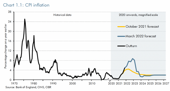 To summarise, the reason why supposed costs of interest in the government's forecasts are rising so much is because current inflation estimates are high. However, they are also forecasting that these will fall, as this Office for Budget Responsibility chart shows: