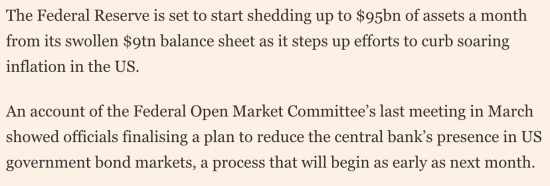 So, at a time when the world is at war, when major supply chains are disrupted, when US households are being devasted by inflation and when recession is likely the Fed decides it is time to take $95bn a month out of the US economy to support a policy of increasing interest rates that will make life a lot worse for US families already facing financial devastation and which will, because so mich international debt is denominated in dollars, be ruinous for many developing countries. And this will solve literally none of the inflationary pressures that exist, because literally none of them has anything to do with the money supply.