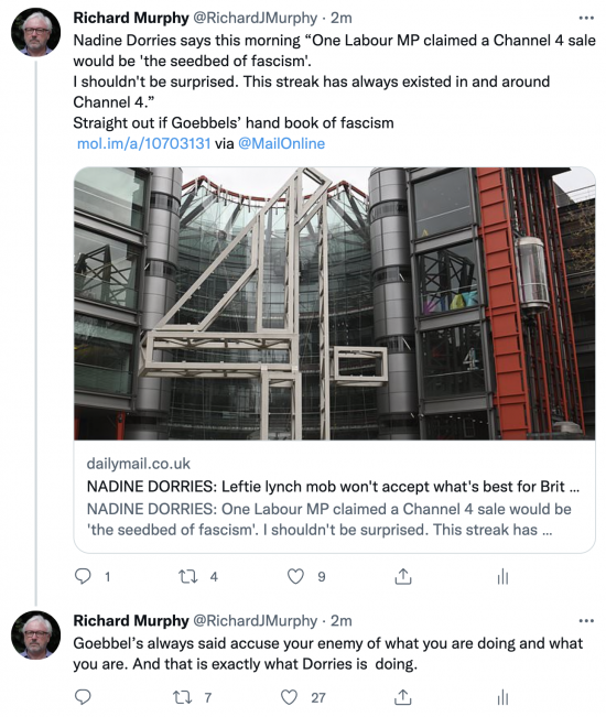 Nadine Dorries is actually claiming Channel 4 is promoter of fascism this morning.