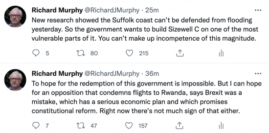 It's a hot day, and I have a lot to do, with the expectation that hay fever will be bad being quite high. So I am afraid that I am getting on with the day job right now. Instead, I offer these thoughts from my Twitter account posted over the last few hours: