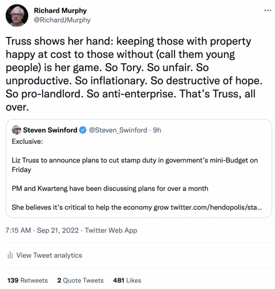 Note my comments. There is not a lot more to add. Except to note that this is another tax giveaway to those already rich at cost to those who are not. How very Liz Truss.