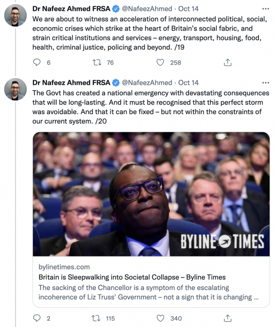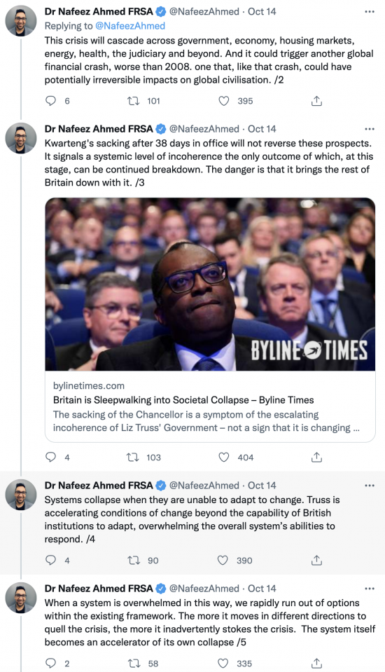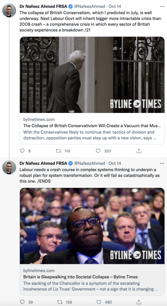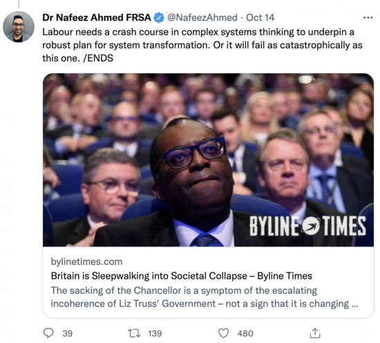This is the third thread by other people I want to share here this morning. This one is by Dr Nafeez Ahmed, who is absolutely right to say Labour has an enormous amount of thinking and changing to do if it is to come close to changing the world we live in. Links are in the original tweets.