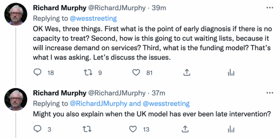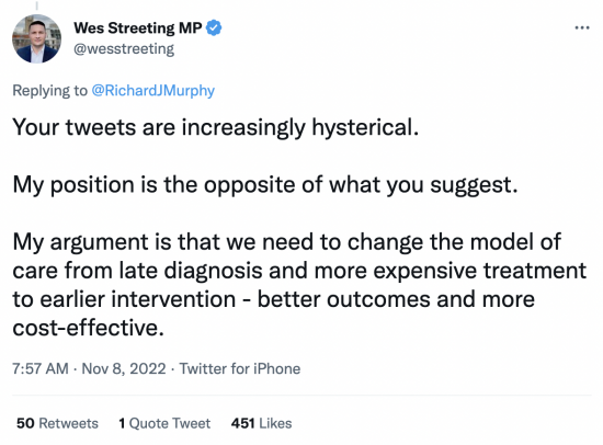 I was planning a calm morning. After minor Twitter storms over the last few days, I thought I would steer clear for a day. Then I noticed this Tweet from Wes Streeting, which I responded to, as I note:
