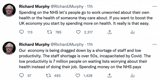 As Richard says, the NHS is an investment multiplier. All that happens when it is starved of investment is that, like any business, it withers and dies. This is clearly the Tory aim for the NHS. They know that would-be doctors and nurses will be reluctant to join an organisation that is being wilfully run down, Even funding for training is being withheld.